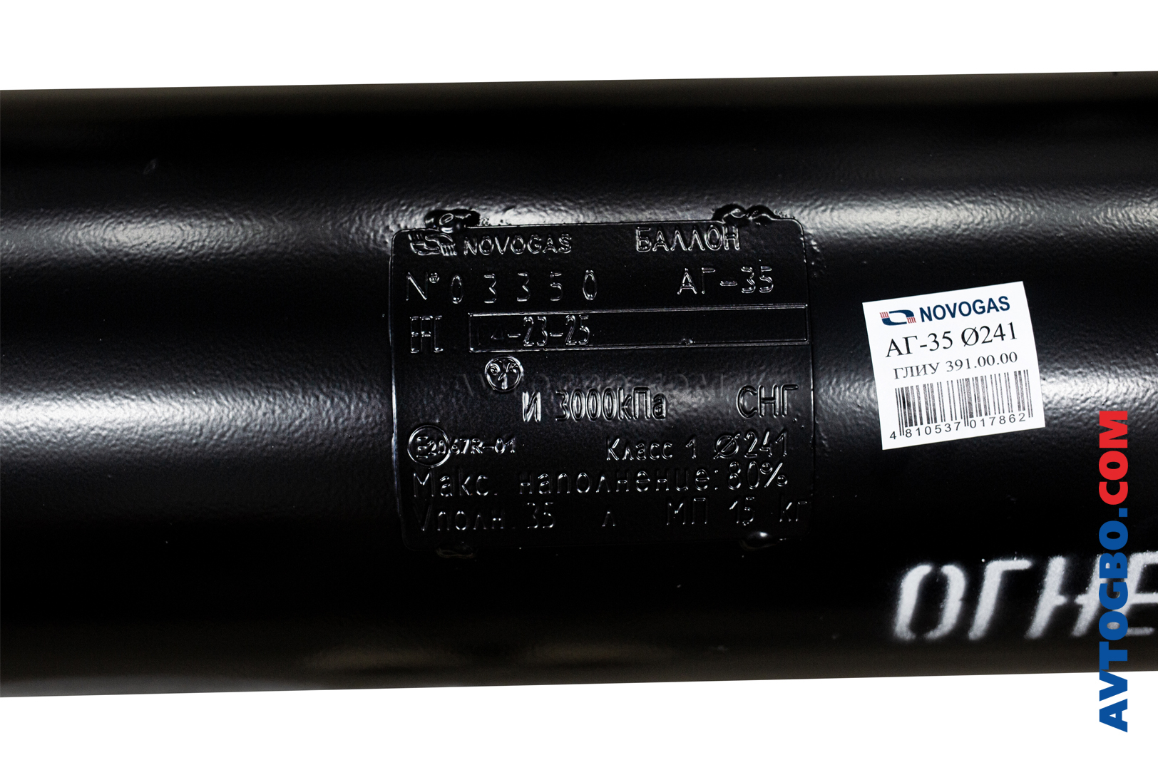 Комплектация: Цилиндрический газовый баллон НЗГА 35 л [241 мм х 877 мм]; паспорт газового баллона.