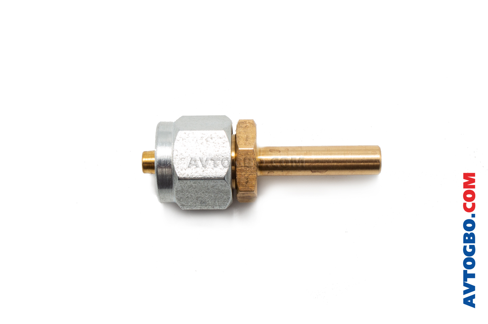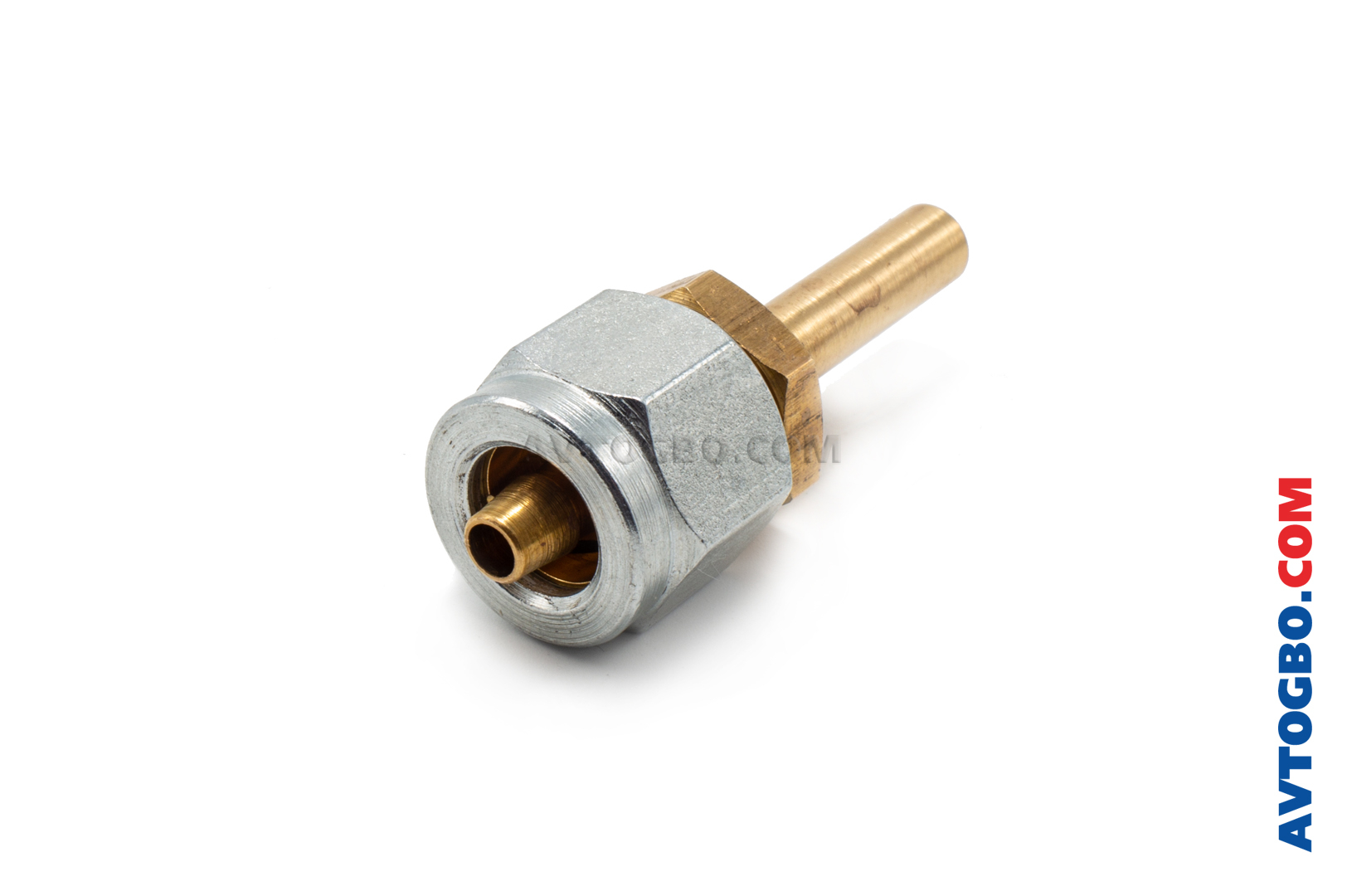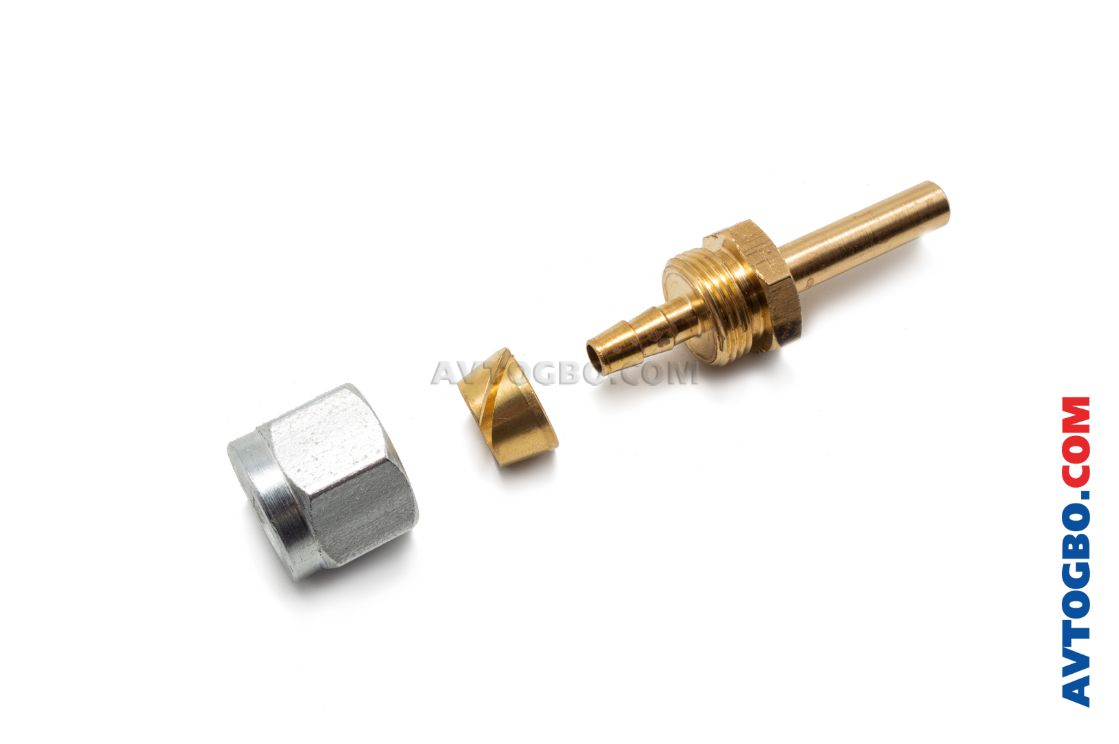Фитинг (соединитель) для герметичного монтажа газовой магистрали (подключения термопластиковой магистрали к редуктору, мультиклапану, газовому клапану, ВЗУ) в сборе: литой корпус (латунь), гайка (латунь/сталь), муфта (латунь).