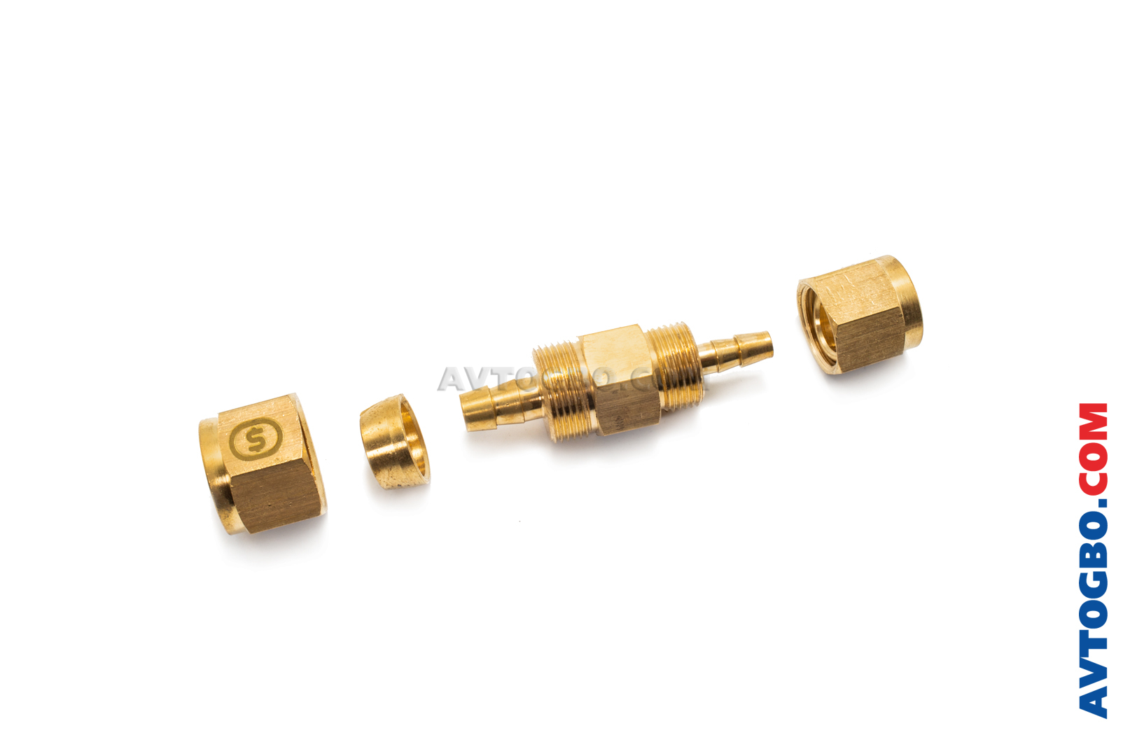 Фитинг (соединитель) термопластиковой трубки для герметичного монтажа газовой магистрали, в сборе: литой корпус (латунь), гайка (латунь/сталь) - 2 шт., муфта (латунь) - 2 шт.